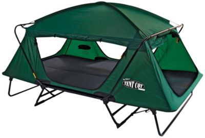 Kamp-Rite Compact Tent Cot with Rain Fly - Double Description : Waterproof coating No-See-Um mesh doors and windows Bed Size - 84inchL x 52inchW Tent Size - 84inchL x 53inchW x 40inchHFolded Size - 53inch x 31inch x 7inch deep Sturdy aluminum frame keeps you 11inch off the ground There is nothing like sleeping on a cot outdoors. During cold weather, it gets you off the heat-stealing ground, and when the hot weather hits, a cot allows your body to take advantage of breezy nights. The Kamp-Rite Double Tent Cot is a versatile piece of outdoor furniture that has a tent built on top of a sturdy aluminum cot frame. Built out of 210D Poly Oxford fabric with a PU waterproof coating and no-see-um mesh doors and windows, the cot provides plenty of ventilation and protection from the elements when needed. Comes with two single 3/8inch foam sleep pads. The Double version of the Tent Cot is built to accommodate two adults, and the inchdome styleinch design allows for extra headroom. By tilting one end you can enjoy the relaxing comfort of a lounge chair during the day or sleeping under the stars at night. Weight capacity: 500 lbs.